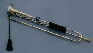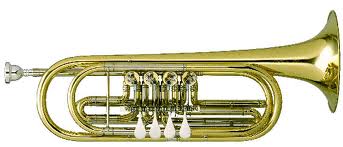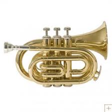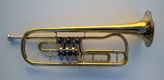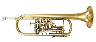 [cylindrical] [conical] | Clarino Trumpet: for baroque period and earlier; before the invention of valves. Trumpets with rotary valves are generally used for 19th century orchestral works. Trumpet in F: very common in 19th century works for military bands. See Rimsky-Korsakov use of F and Eb alto trumpets. Bass trumpet: plays in treble clef in Bb or in *bass clef (sometimes tenor). Frequently played by a trombone player. Bb Cornet: transposition and playing range, basically the same as Bb Trumpet. Often used in pairs with trumpets. Flugelhorn: same as Bb trumpet but not for upper range. More mellow sound, softer. Posthorn: not generally for orchestral works but posthorn (with valves) is scored in Mahler Symphony No. 3. Pocket trumpet: in Bb, generally poor sound and intonation. |