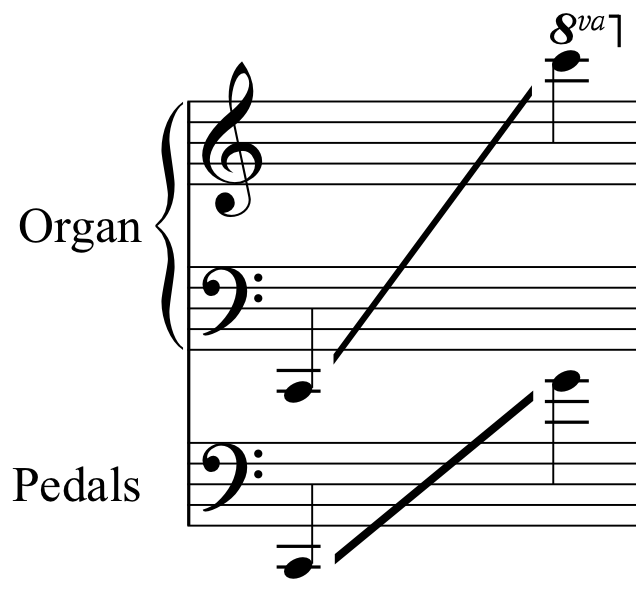 Manuals, as written (can be 1 octave lower or 2 octaves higher with registration); Pedals, 1 octave lower (can be up to 1 octave higher with registration. | These ranges also apply to electronic organs that are designed to simulate pipe organs; non classical electronic organs often have shorter than standard manual and pedal keyboards. (contrib. Randall Wilkins) | |